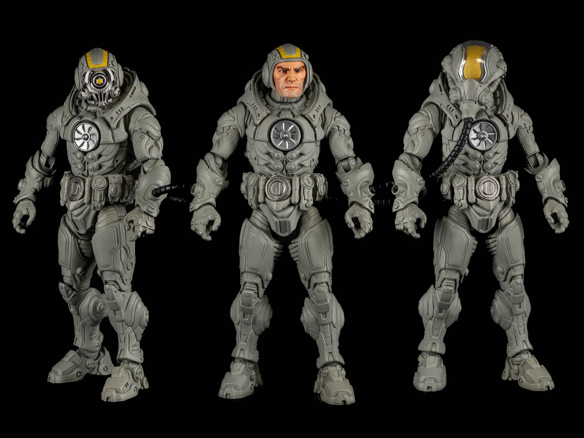 The "Upgrade Pack" includes a new helmeted head with flexible tube, plus a second "space cowl" head with a humanoid face plate and a robotic face plate. Those plates can also be used with other compatible Cosmic Legions and Mythic Legions figures (some examples of which are shown in the product pictures here).
