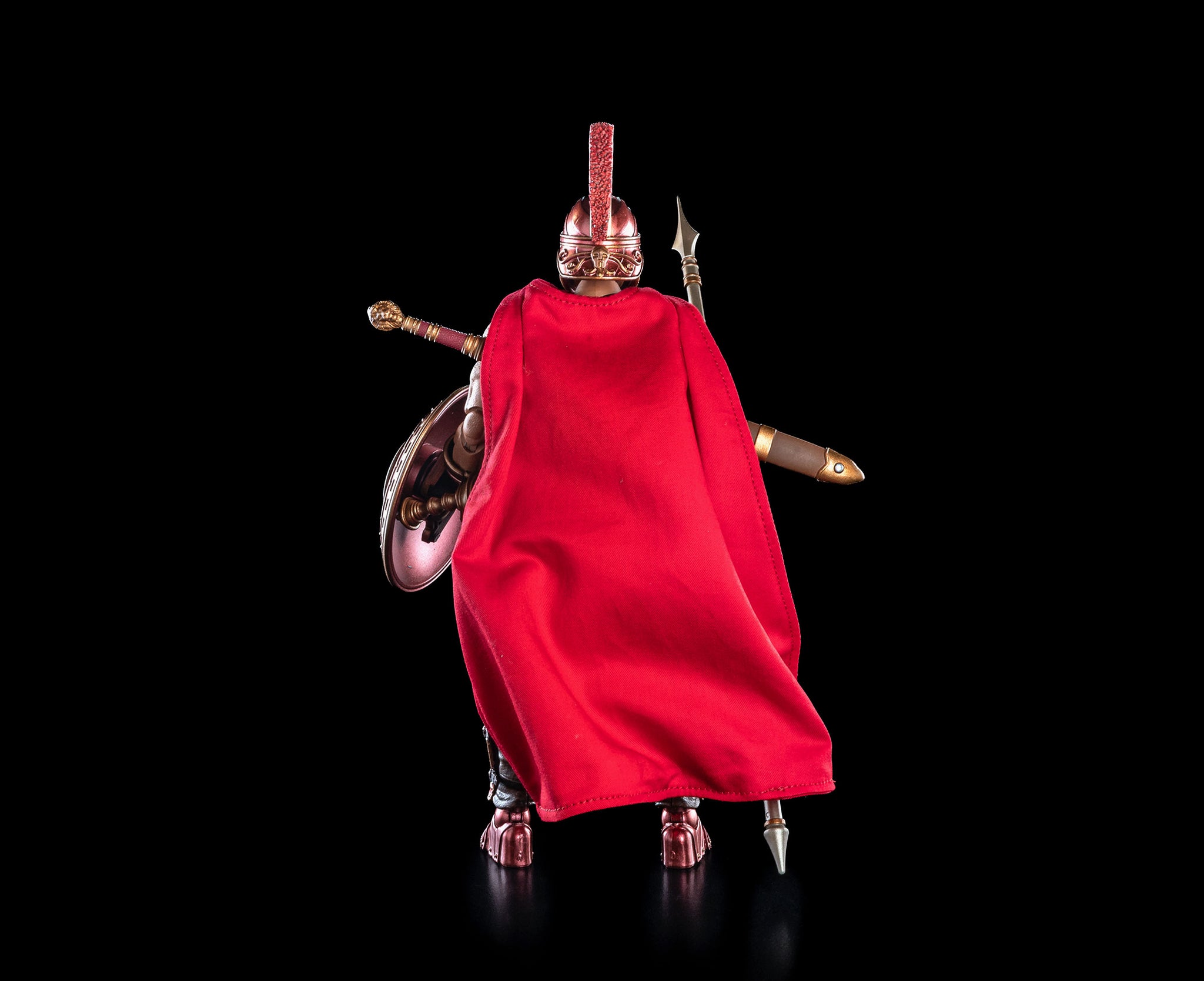 Vitus Prime stands approx. 7” tall and comes with an unmasked head insert that can be used with the hair to create his fully unhelmeted look or with the Mercurain helmet! There is also a second "blank" insert for the Mercurian helmet. Vitus Prime also comes with a broad sword and scabbard, short sword and scabbard, spear, shield with new boss, large bedroll, extra hands, and 2 sets of feet (armored and sandals) plus premium wired soft goods cape and skirt.