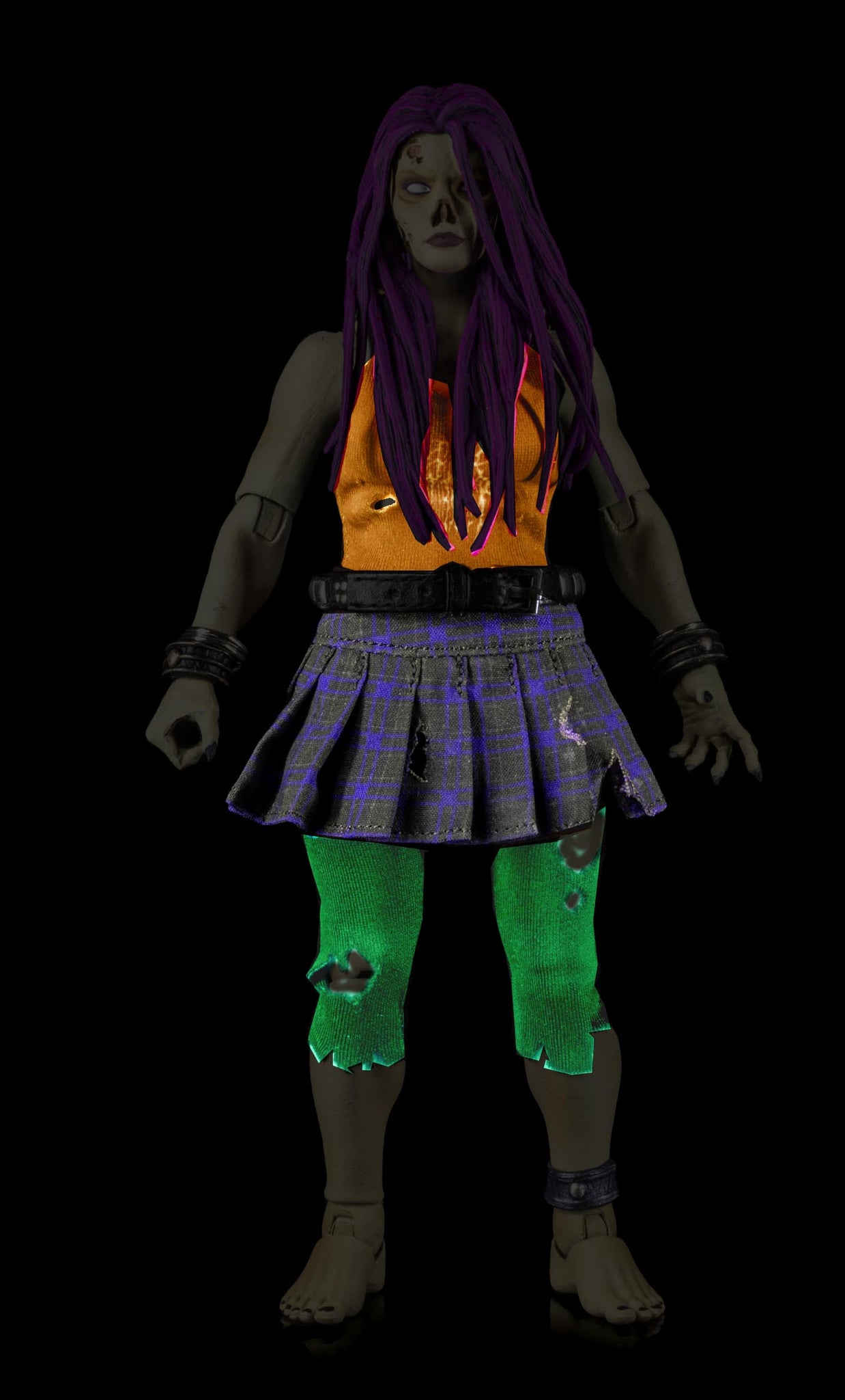 This is for the SOFT GOODS SET ONLY (zombie figure sold separately). This set includes alternate colors for the soft goods found on the Rocker Zombie, allowing you to mix and match to customize your zombie horde! This sets includes a plaid skirt in blue, green torn leggings, a studded belt, and an orange shirt with the Four Horsemen death metal logo on it!